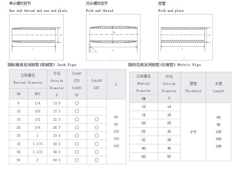 短節(jié)是工業(yè)管道連接中常用的一種配件。常見的有螺紋短節(jié),分為雙頭外絲、單頭外絲、平頭外絲幾種,另外還有以法蘭連接的短節(jié)等。