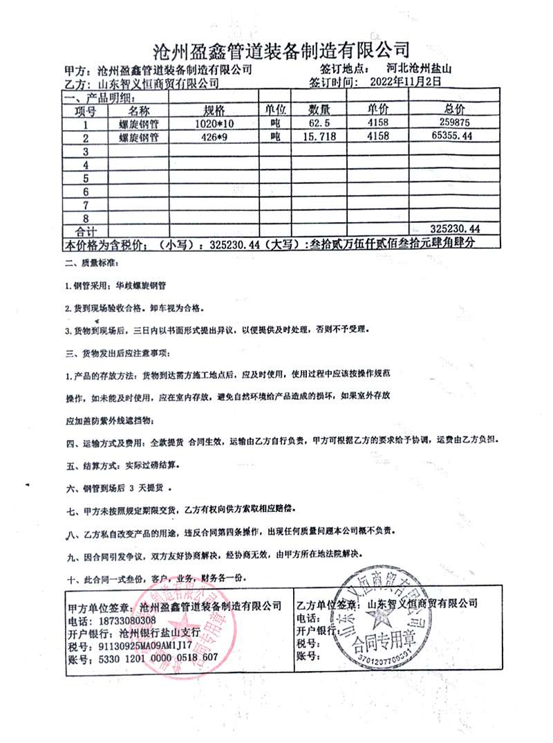山東智義恒商貿(mào)與我公司達(dá)成螺旋鋼管管道采購合作項(xiàng)目